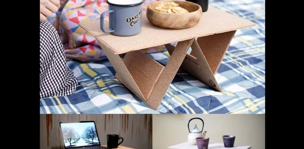 在宅ワークやアウトドアで活躍。折り畳めるコルク素材のミニテーブル「ポータブラ」