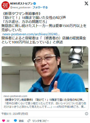 「助けて!」18階まで届いた女性の叫び声「カネ返せ、カネの問題だろ」無慈悲に刺し続けたストーカー男は愛車1500万円以上を売却していた