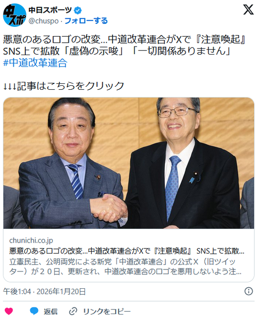 【中道】悪意のあるロゴの改変…中道改革連合がXで『注意喚起』 SNS上で拡散「虚偽の示唆」「一切関係ありません」